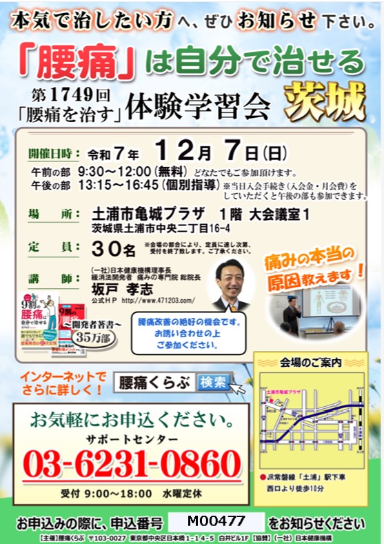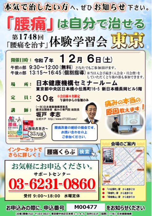 日本健康機構が主催する腰痛をなおす体験学習会。全国で土曜日日曜日祝日を使って、月8回以上開催しています。午前中はだれが参加しても無料です。午後は会員限定で開催しています。