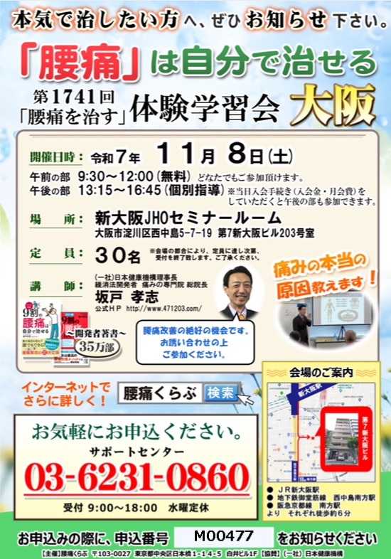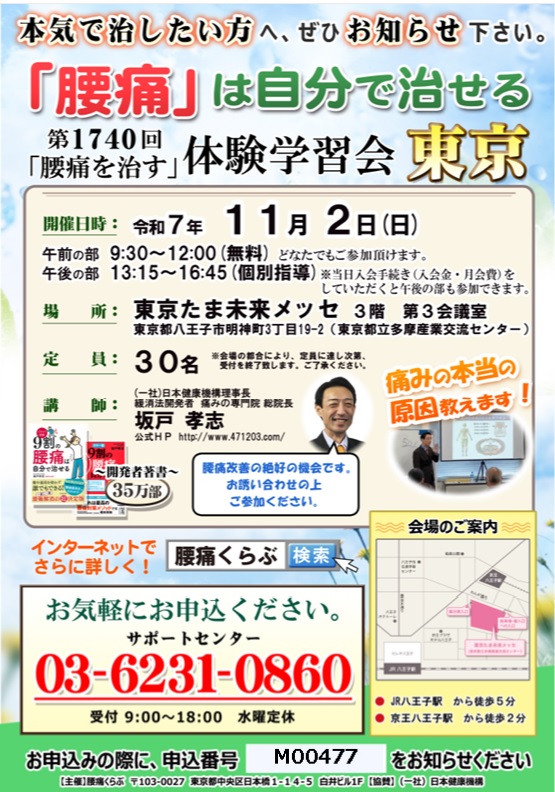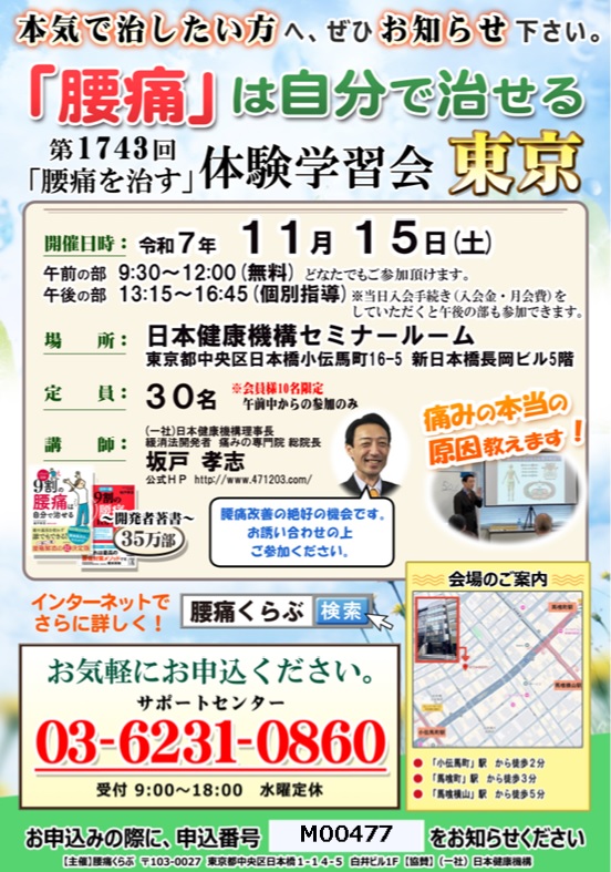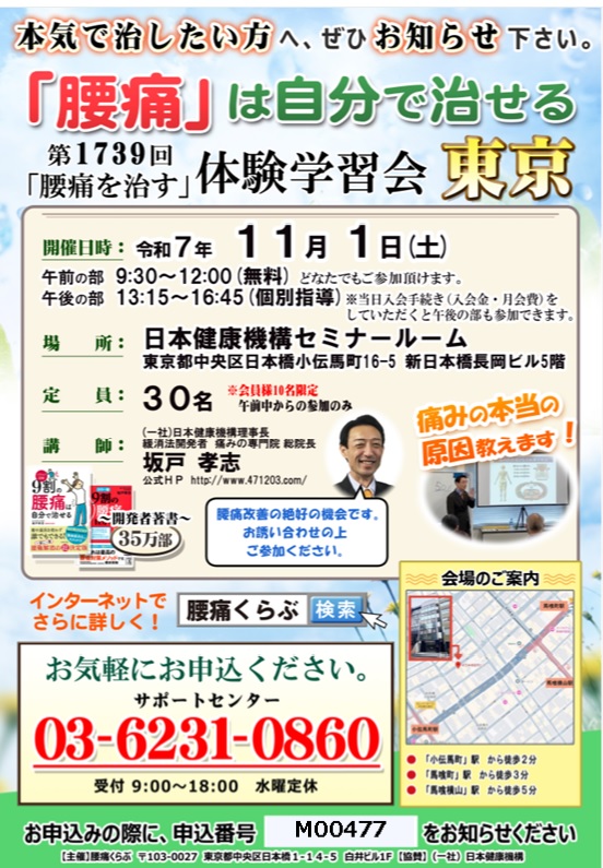 日本健康機構が主催する腰痛をなおす体験学習会。全国で土曜日日曜日祝日を使って、月8回以上開催しています。午前中はだれが参加しても無料です。午後は会員限定で開催しています。